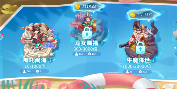 1、玩家进入界面可以看见多种不同的捕鱼主题场景;