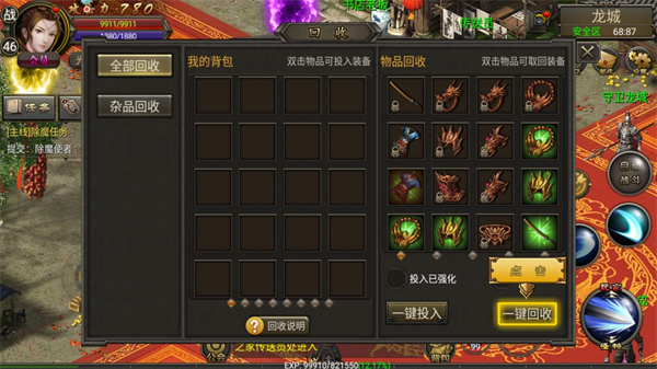 回收装备:在游戏过程中,你会获得大量的装备,其中不乏一些低等级或暂时用不上的装备。不要将它们随意丢弃,这些装备可以在龙城的装备回收员处进行回收,回收后不仅能获得一定的金币,还有机会得到血符碎片。合理利用回收系统,既能清理背包,又能为血符升级积攒材料,一举两得。