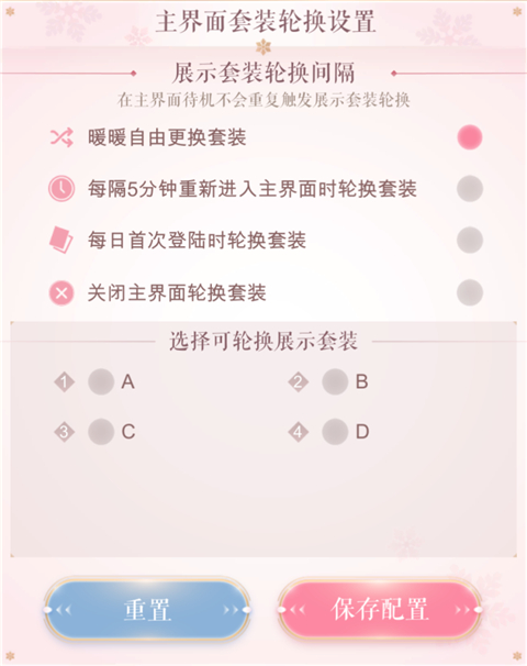*若搭配师不希望轮换,可点击关闭主界面轮换套装。此时主界面将展示搭配师在此界面最终编辑保存的该套套装及动作、镜头。