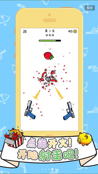 双枪王者是一款非常好玩的射击小游戏,玩法简单但很考验技巧。游戏里你有两把枪,目标会从屏幕下方往上移动,你需要用左右两边的按钮开火,子弹会自动瞄准。每次击中目标会有击退效果,但如果开枪太猛可能会让目标偏离轨道甚至飞出屏幕,导致失败。关卡里有很多目标需要击碎,能量条归零就能过关。