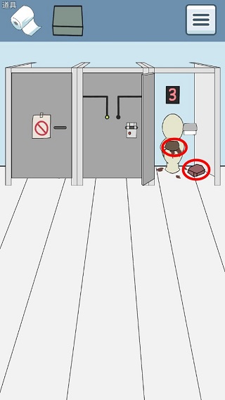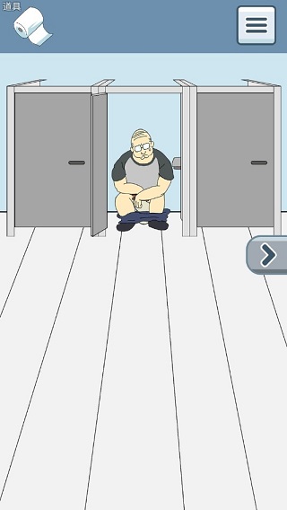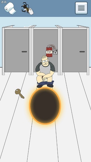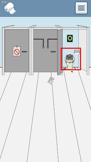 第二关:开始出现了误导道具,这关打开最左边的门,然后打开厕所盖,会出现一个人头,这时点击一下人头给纸,即可过关。