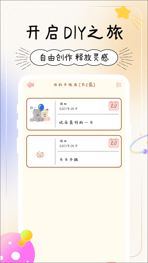 此外用户还能在集市中选择自己喜欢的背景图片、画笔类型、字体种类、贴纸等,让您体验真实的手帐制作。它是记事本,也是日记本,更是你的生活小助手。花样笔记天天手帐陪你一起,让一个人的时间也充满乐趣~