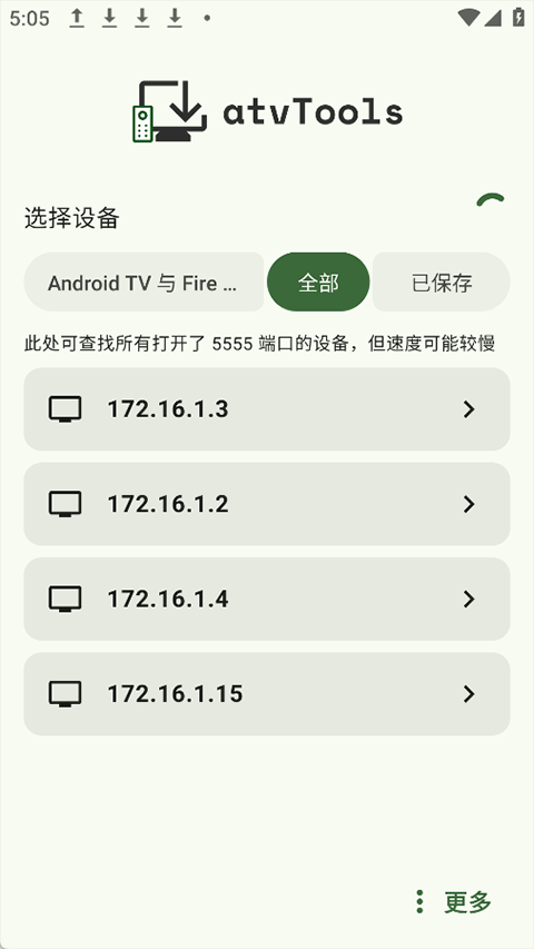 4、手机上打开atvTools安卓版,打开后自动搜索同一网络下的电视设备。