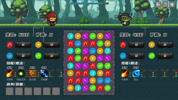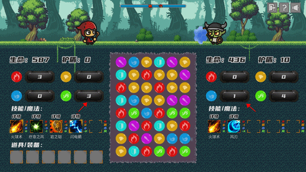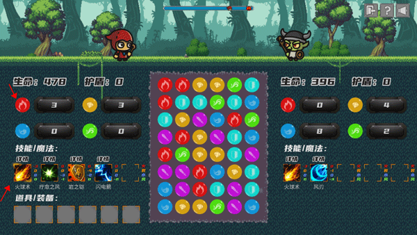 4、将三个颜色相同的小球消掉之后,角色就可以获得相应的技能,这些技能可以攻击右边的小怪物。