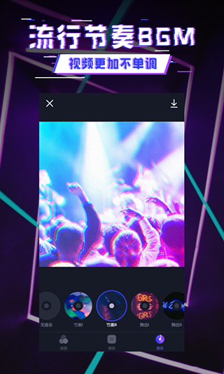 精心挑选多种律动BGM,动态效果与音乐节拍完美匹配,为视频增加节奏感,让你的小视频一点都不单调。