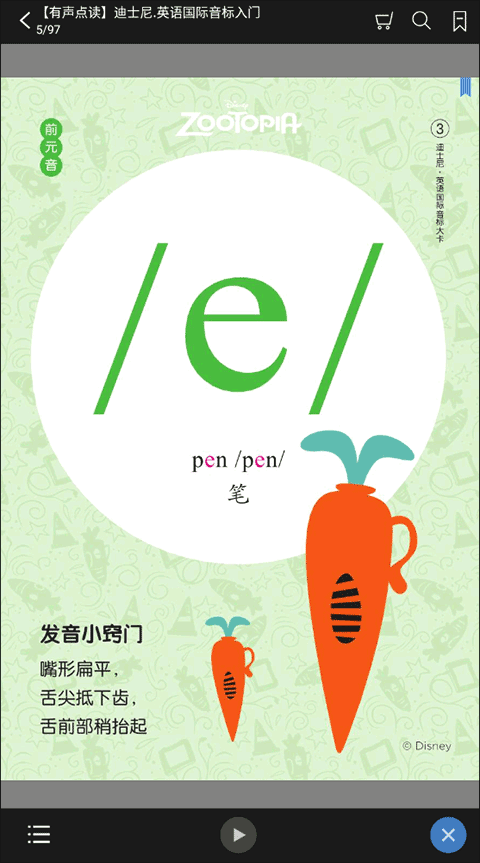 迪士尼英语国际音标入门app以迪士尼疯狂动物城的形象为切入点,带领孩子们学习英语国际音标,寓教于乐、全彩设计、易学易记。软件拥有音标书写、发音窍门、单词示例、常见发音字母及字母组合、绕口令等丰富内容,并且全书英文由外籍专家朗读,可点读,适用于学龄前儿童在家长陪伴下学习,及小学阶段需要系统学习音标的学生。