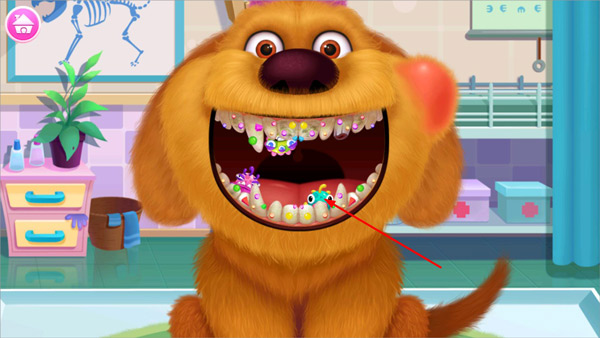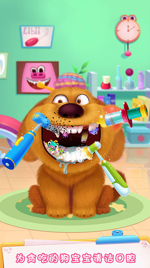 1、打开毛绒宠物医院小游戏,进入宠物医院,首先是帮助贪吃的狗狗治疗蛀牙;