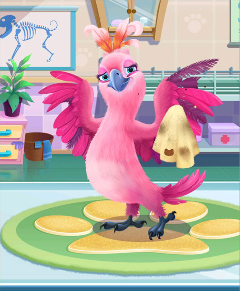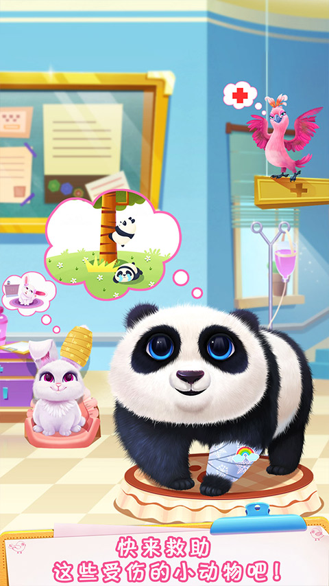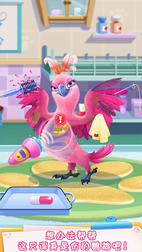 游戏里有六只可爱的宠物和十二种不同的治疗方案,玩法简单又有趣。比如给狗狗刷牙拔牙,或者帮鹦鹉清理伤口、缝合羽毛。每次看着这些小动物们从病怏怏的状态变成活力四射的样子,真的很有成就感!而且每天都有新的任务,还会根据表现获得爱心,用来装饰医院。