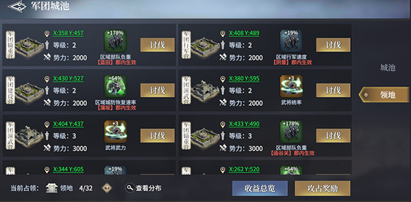 增加军略点数,此种类型的军团城池产出每天产出一定数量的军略点数