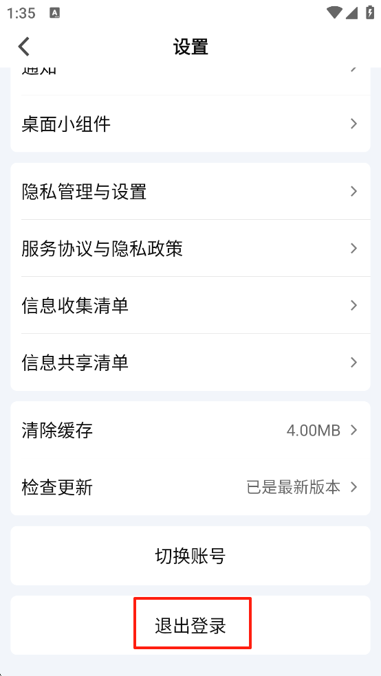 3、然后在【设置】界面下滑到最底端,点击【退出登录】