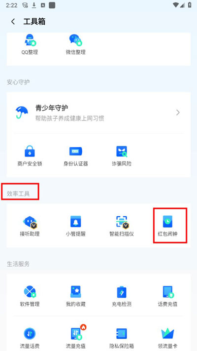 2、下滑至效率工具栏选择红包闹钟