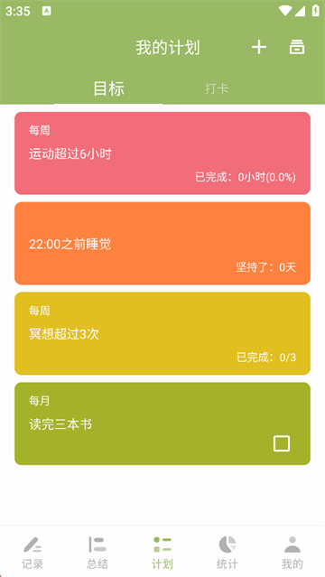 1、卡片式计划表,可设定短期或长期目标,并支持打卡功能,增强执行力。