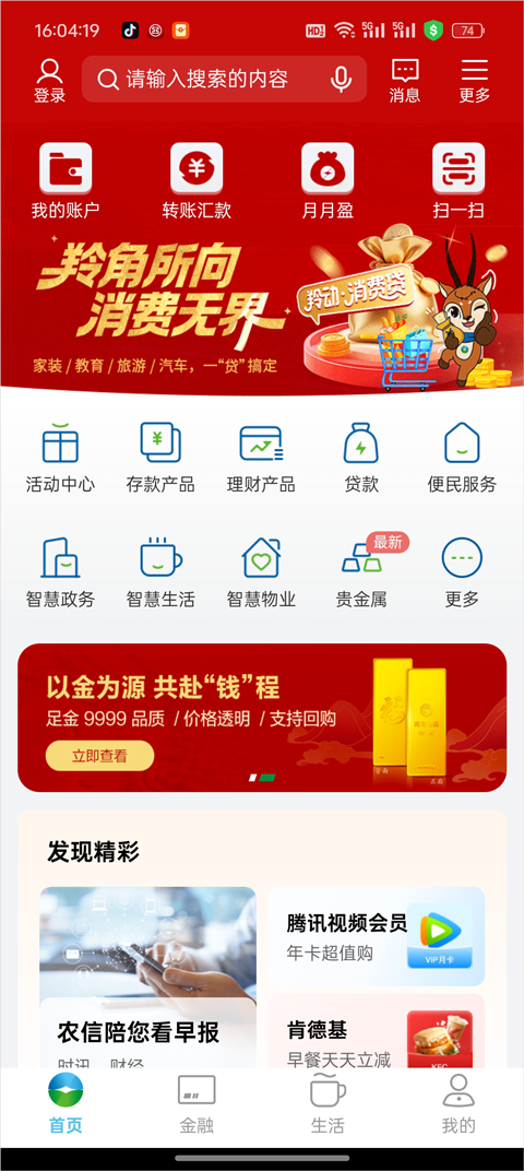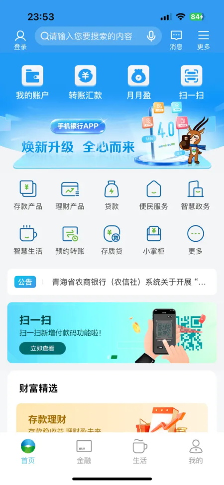 用户可以在首页直接查看账户余额、最新交易动态以及常用功能入口,如转账汇款、智慧政务、贷款等,同时还设置了金融资讯与优惠活动展示,让用户在登录第一时间就能掌握最新的理财与服务信息。