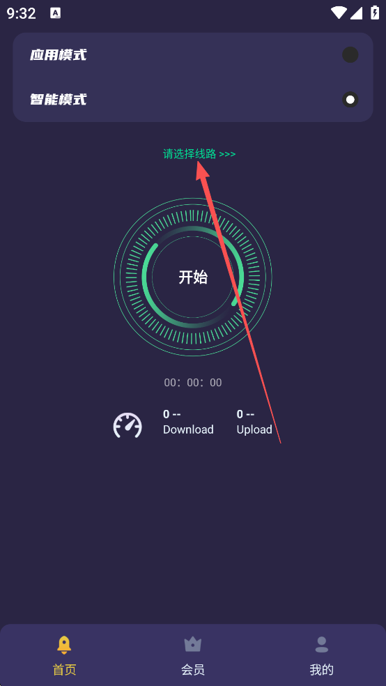 1、打开软件,注册登录之后,点击智能模式,选择线路