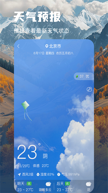 全国所有地区天气的精准预报,实时监测。涵盖了温度、体感温度、气象、风级风向、湿度、气压等关键数据信息,以及明天、后天的天气概况预报。