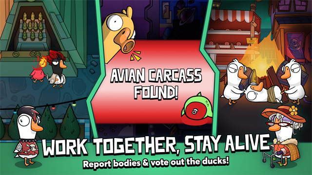 这是新的万圣节模式,鹅被分配为村民,鸭子是吸血鬼。村民必须完成召集会议并投票淘汰吸血鬼的任务。如果你被吸血鬼杀死,你将变成一个奴隶,帮助吸血鬼找到或杀死其他村民。如果您是剩下的最后一个村民,计时器将开始,如果吸血鬼或奴隶找不到您,您将赢得比赛。
