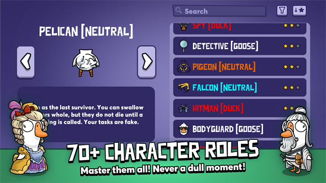 在秃鹫的角色中,如果你吃掉一只被谋杀的鹅的尸体,你会赢得比赛,而猎鹰的杀戮速度更快,而如果他把剩下的鹅全部杀死,他就会赢得比赛。鸭子可以使用变形能力进行模仿,并且必须首先杀死猎鹰和所有其他鹅才能赢得比赛。
