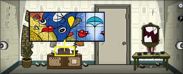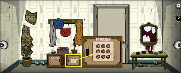 4、打开中央桌子下方右侧柜门,该柜需按特定顺序点击按钮解锁,正确密码为:371856249。开启后获得【美工刀】。