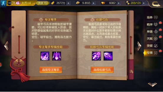 武将达到74级且进阶至4阶开启,每个兵种都有两个专精方向,专精可以互相切换,每日可免费切换一次。
