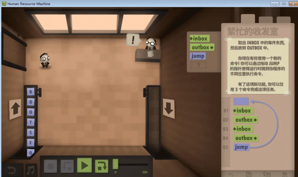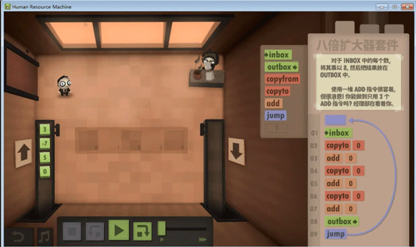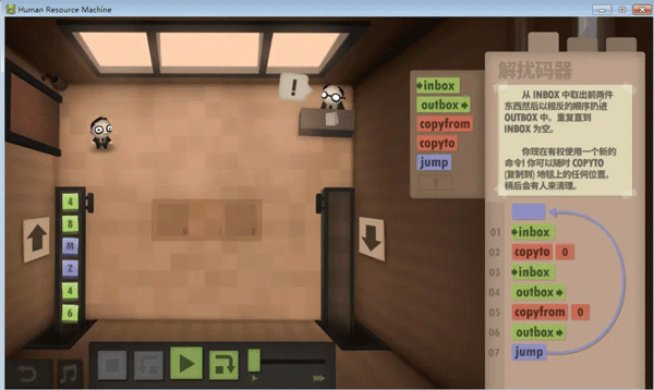 人力资源机器(又名程序员升职记)是一款非常好玩的宅男编程解谜游戏,在游戏刚开始的时候你只是一个小职员,在每一层中你的上司都会给你分配一份任务,而你则需要给小职员编程来自动化你的任务,成功之后你就能晋升到这幢办公楼的下一层工作一年,层层递进,直到你进入到这幢巨大办公楼的顶层。虽然这是一款编程解谜游戏。但即使你从未接触过编程也不必担心,写程序和解谜差不多,去掉所有的0和1以及各种弯弯曲曲的括号就可以了,编程其实很简单,任何人都可以从这款游戏中理解编程并获得乐趣。在人力资源机器的游戏世界里,为了完成一个接一个的任务,需要你大开脑洞,游戏拥有很完整的剧情,很容易将你带入到游戏当中。