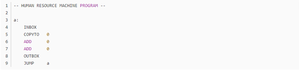 对于INBOX中的每个数,将其乘以8,然后把结果放在OUTBOX中。