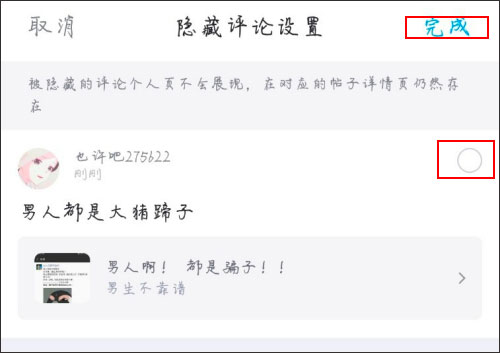 4、然后选择你想要隐藏的评论,勾选它,并点击上方的完成即可。