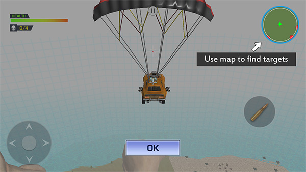 3、进入游戏开始跳伞,玩法和吃鸡一样,右上方为地图,左右分别是控制车的移动和射击。