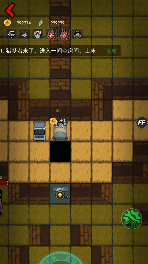 4、第二关由宿舍阿姨镇守,如果房间道具没有造满,她是可以遁地进入房间。她还能回到地图中间回血,可以趁这个时候,造炮塔攻击。