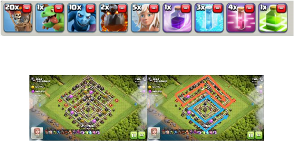 2、如果阵型外面有非对空防御建筑可以使用气球兵低成本清理掉,并起到断边的作用。