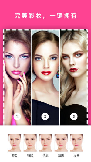 彩妆相机app是一款功能强大的美妆相机应用软件,可提供素颜自拍、时尚妆容、随心试妆等特色功能,用户只需要打开相机功能即可智能识别人脸,自动为用户滤镜补妆。在这里不仅有烟熏妆、韩妆、日系妆、明星妆、搞笑妆等超多风格各异的妆容,还有火爆朋友圈微博的唇彩、眼影、眼线、眼睫毛、腮红、美瞳、双眼皮、腮红、粉底、牙齿美白、祛眼袋,让你high到停不下来,让你素颜自拍也能美美哒。