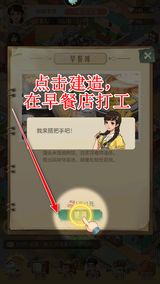 3、点击建造,在早餐店打工。