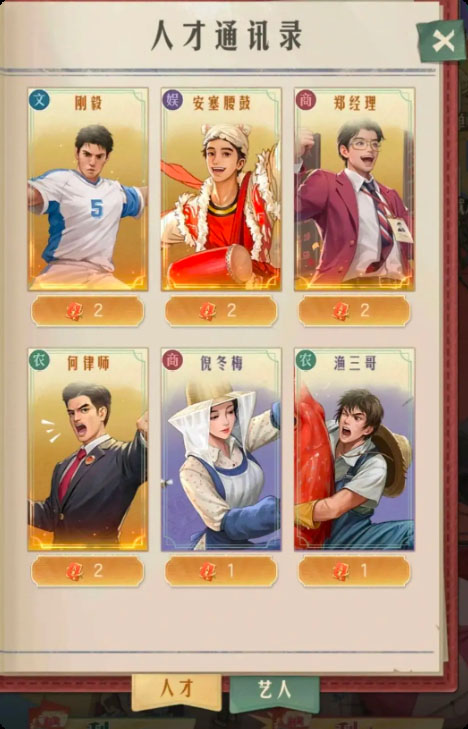 上述珍贵品质的人才中,【人才-郑经理】、【人才-安塞腰鼓】和【人才-刚毅】的可产生羁绊艺人相对容易获取,尤其是【郑经理】,其艺人数量众多且获取门槛较低,因此可以作为我们0氪及微氪老板前期发展的首选。