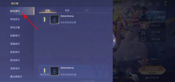 4、在这里可以查看段位排行、传说战力、传说之巅、热度排行、英雄排行等,点击来到英雄排行,就可以查看自己的英雄战力在好友中和全区的排行情况。
