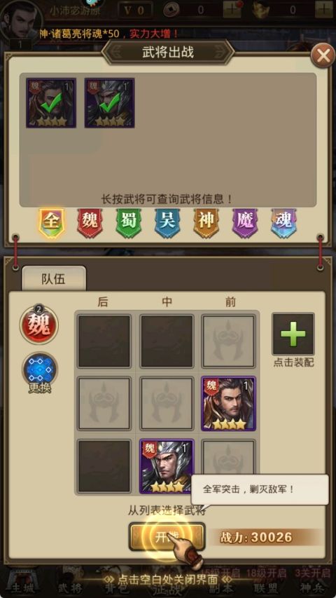 2、策略战斗:玩家需要全面培养武将,了解他们的技能,并合理地搭配阵容来迎接挑战。