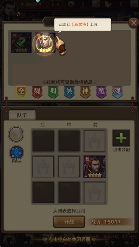 7、武将升级,穿戴装备,增加战力,然后就可以继续征战四方啦。征战章节越高,奖励越好,挂机收益越大。