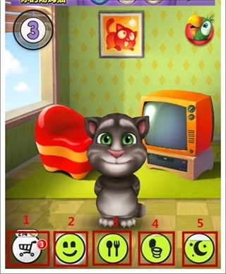 点击这个按键会带汤姆猫到客厅,在这你可以和他互动起来还可以和他一起玩游戏。