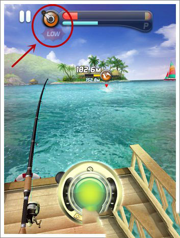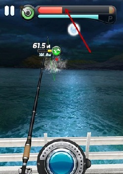 在鱼上钩之前,屏幕会有短暂的卡顿,这时你就要按住卷线轮了,然后当进度条触及最右的禁区时,立即松手,然后再按下去,再去触及禁区,这样有节奏地来回游走,就可以不断获得气力。积攒10次气力,就可以让鱼眩晕了,这是对付高星鱼的唯一方法。具体操作很讲究技术,但玩多了,就会掌握到一种节奏感,相对就不是那么容易失手了。
