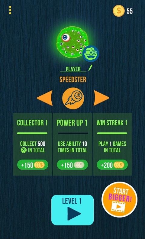 游戏的画面设计也很独特,软泥的外形看起来像史莱姆一样灵动,而且“外星”风格体现在它们的眼球造型上。随着你的成长,眼球的数量会越来越多,胆小的朋友可能会有点害怕哦!游戏里还有各种皮肤可以解锁,通过金币或者升级都能获得,每次比赛结束后都能用这些奖励来提升自己的实力。