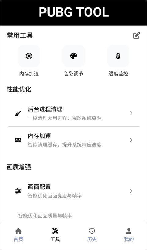 绝地求生画质助手官方最新版英文名也叫:PUBG Tool,作为一款能够帮助广大玩家更好的玩耍游戏的画质修改软件,其总体的功能十分的强大且丰富,包括:画质优化、画质帧数、游戏优化、以及突破官方锁定画质和帧数的限制等相关功能,有了它之后你即使你是低配手机从此玩游戏也会非常顺滑,不会有明显的卡顿,从而轻松吃鸡获得第一名。