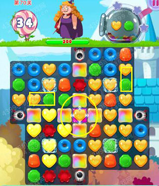 虽然本关胖女巫生命值有200,但在导弹糖果的加持下,其实难度也没想象的大。只要把中间获得加持效果做好的彩虹糖位置打通,然后把黄绿两色糖果都击中在这个地方来消除即可。