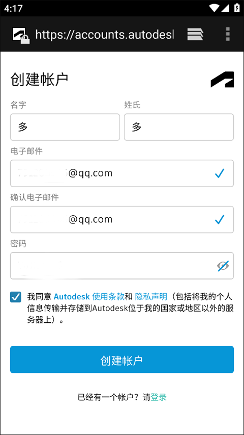 1、在本站免费下载该软件,下载安装之后打开,如果你有autocad账号直接登录即可,没有得话就需要创建一个账号了,创建账号也是非常的简单,输入名字、姓氏、电子邮件、以及密码点击创建就可以了。