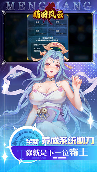 萌将风云0.1折版是一款以古代三国为背景的卡牌类网络游戏,采用精美的Q版人物,高度还原了三国的英雄和剧情,加入了西游记等多种神话人物,形成了一场穿越时空的战斗,三国人物与神话人物的碰撞,擦出不一样的火花,让你体验一次全新的混战三国游戏体验。在奇幻的冒险中当然少不了萌妹相伴了,小龙女、妲己、孙尚香、大乔、祝融倾情助力,玩家可以赠送她们礼物,以此来获得好感度,而好感度等级的增长又能够为所有武将加成属性,分分钟轻松提升战力。除了萌妹之外,萌将风云游戏为玩家准备了丰富的玩法活动,一骑当先、战技无双、过关斩将等等活动,不但将给予玩家除“推图”之外的更多乐趣,还能提供海量武将成长材料,让玩家培养武将起来更加简单,感兴趣的朋友快来下载游玩吧。