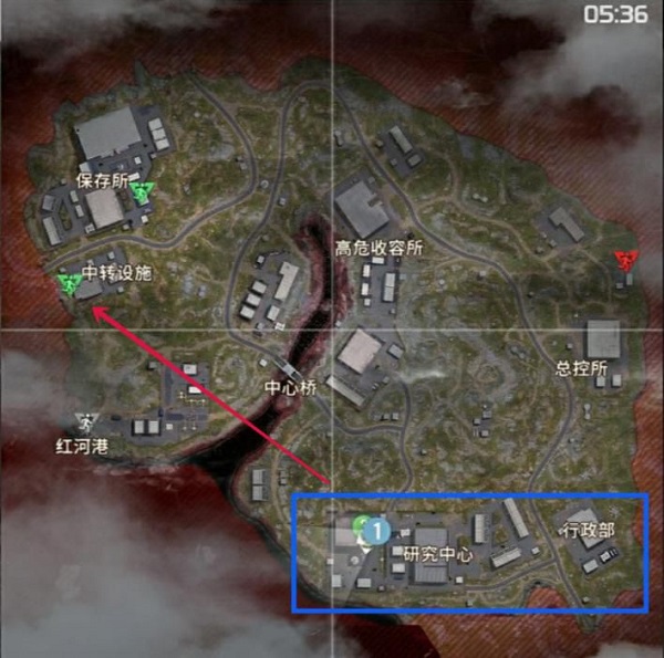 去中转中心撤离点的时候,一定要避免与他人冲突。例如中心桥这个区域,不要从桥上直接走,从上图所画的路线走水路过河,到达中转设施撤离点即可。