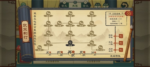 - 文化流派:游戏中有九大文化流派(儒、法、兵等),影响国家发展和人才使用。通过文化影响力可以吸引城池归降。