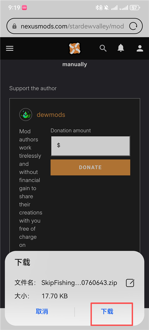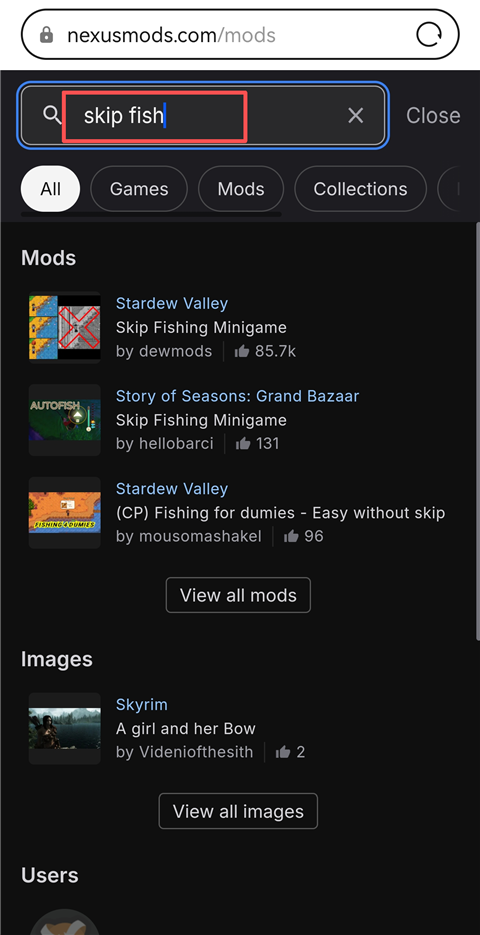2、然后再搜索栏中搜索自己想要的mod下载,以钓鱼mod为例,搜索【skip fish】。