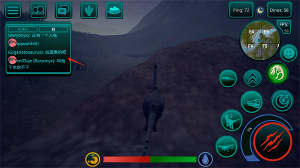 3、食物提取,如果恐龙是掠食者,那么你需要杀死其他玩家的恐龙才能得到自己的肉,如果你是草食动物,那么食物就更容易了,你需要特殊的蕨类植物,你可以得到足够的他们!地图上任意湖泊、水库都可以饮用。