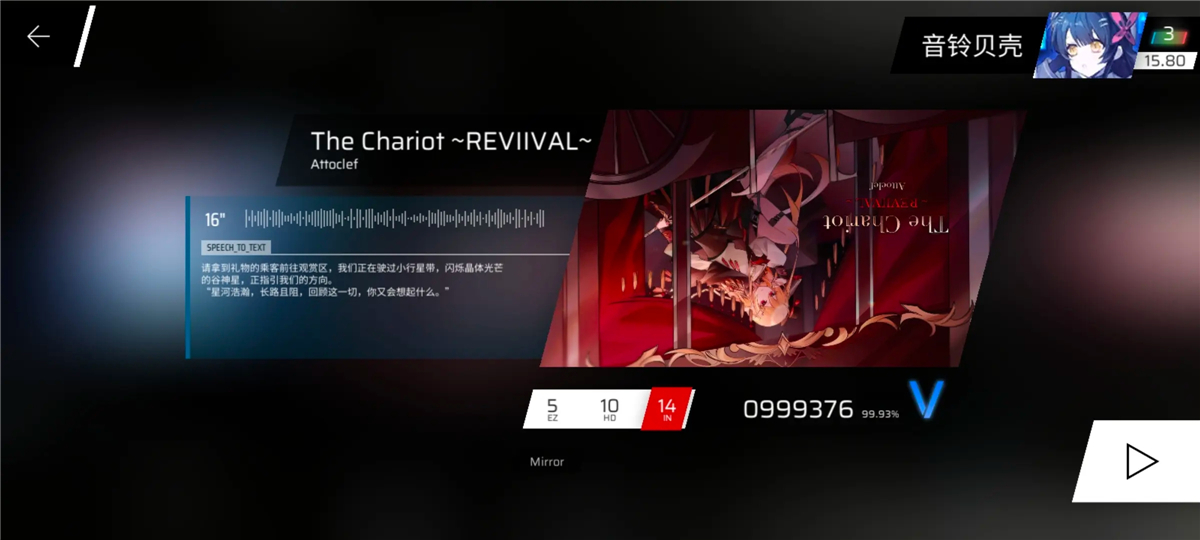 1、当你进入选歌界面的时候,会看到主界面右上方有这样一个名片,这个名片右下角那个数字就叫作RKS。下图为15.00的RKS。