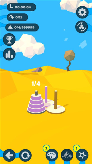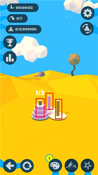 2、进入游戏后,我们可以看到三根木桩,在木桩的上面有着三个圆柱体,玩家只要将它从大到小的依次放在相同颜色的木桩即可完成挑战;