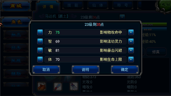 4、升级后可以获得属性点,点击左上角的头像点击+号选择人物加点即可自定义加点了;