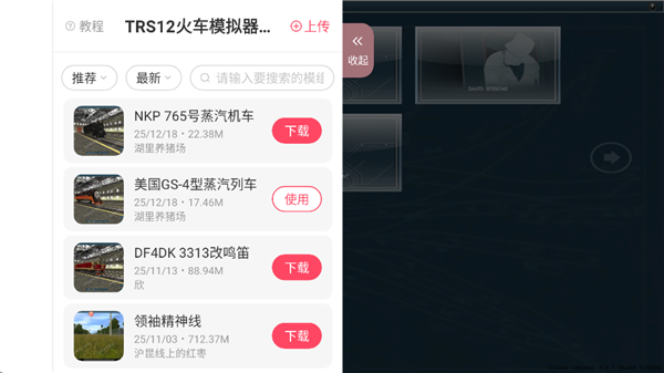 1、进入trs12火车模拟器内置模组,点击【虫虫助手】的悬浮窗下载建筑模组。